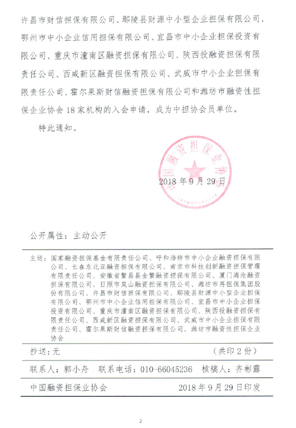 我集團全資子公司長春東北亞融資擔保有限公司自7月26日注冊成立以來,相繼完成了業(yè)務流程設計、制度體系搭建、人員招聘、軟硬件設施建設等一系列業(yè)務開展前期準備工作。為了及時把握政策動態(tài),提高公司規(guī)范化管理水平,加強與業(yè)內其他機構的交流與協作,擔保公司向中國融資擔保業(yè)協會遞交了成為會員單位的申請。9月29日,擔保公司收到了《中國融資擔保業(yè)協會關于批準東北中小企業(yè)信用再擔保股份有限公司等23家機構成為副會長、理事、會員單位的通知》,正式成為中國融資擔保業(yè)協會會員單位。